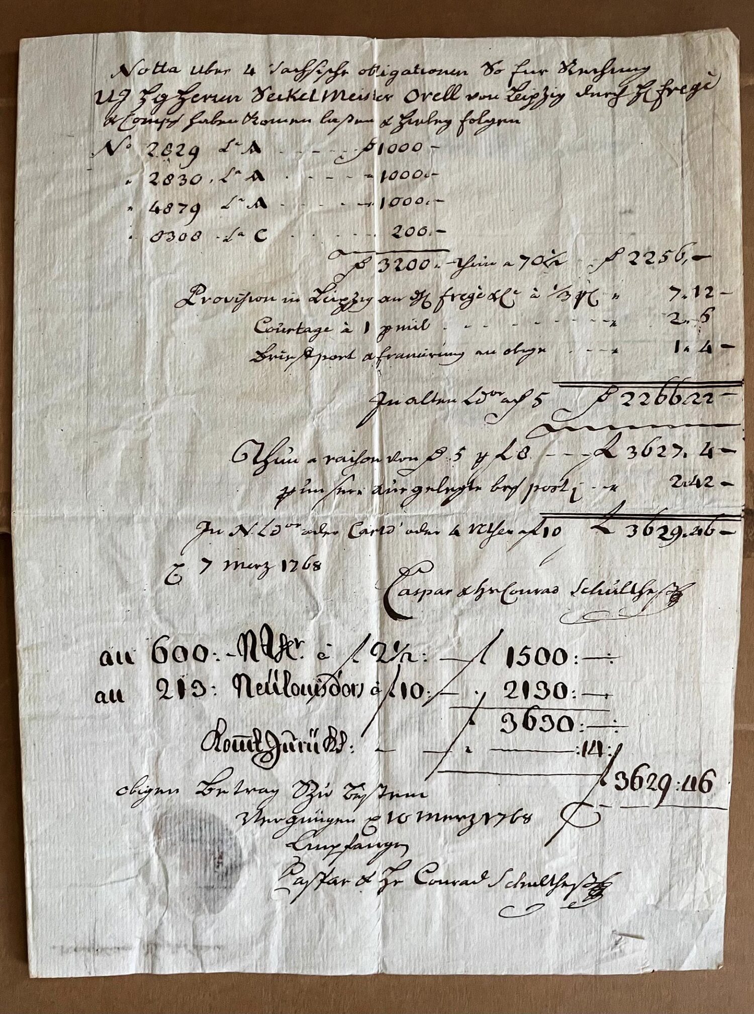 Anleihe, gezeichnet von Caspar und Hans Conrad Schulthess (ältestes noch existierendes Dokument unserer Bank)