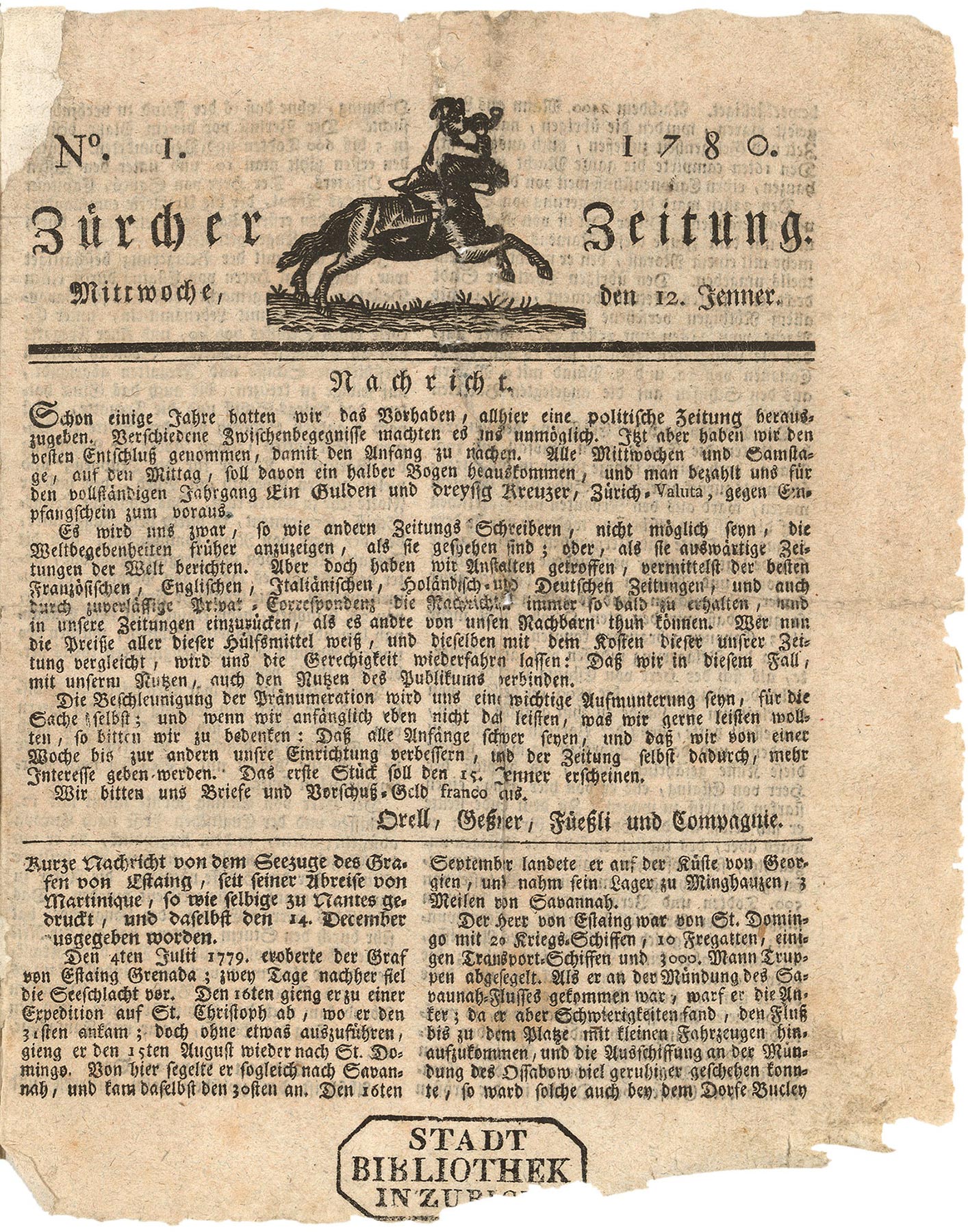 Gründung der (Neuen) Zürcher Zeitung durch Salomon Gessner im Verlag Orell, Gessner, Füssli & Co.