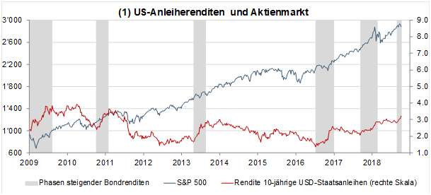 Die steigenden US-Bondrenditen haben die Zinsdebatte wieder angeheizt. Der Zusammenhang zwischen dem allgemeinen Zinsniveau und der Performance ist bei Obligationen einfach erklärbar: Steigt das allgemeine Renditeniveau, müssen die zukünftigen Coupons mit einem höheren Zinssatz abgezinst werden, was (in Abhängigkeit von der Laufzeit und der Höhe des Coupons) zu sinkenden Marktpreisen führt. Bei Aktien sind die Zahlungen in Form von Dividenden hingegen von der erwarteten Gewinnentwicklung abhängig. Der seit 2009 vorherrschende Seitwärtstrend der US-Anleiherenditen wurde viermal durch eine kurze Phase steigender Renditen unterbrochen (siehe Grafik 1). Diese Perioden haben die Aktienmärkte meist einigermassen gut überstanden. Die Erklärung für dieses Phänomen ist, dass höhere Zinsen in der Regel ein besseres konjunkturelles Umfeld und steigende Teuerungsraten vorwegnehmen, die zu höheren Gewinn- und Dividendenerwartungen führen. Die Redewendung «steigende Zinsen sind Gift für die Börse» gilt erst, wenn das Zinsniveau einen gewissen Schwellenwert überschreitet. Die Frage, ob und ab welchem Zinsniveau ein solcher Regimewechsel stattfindet, kann nicht schlüssig beantwortet werden. Der entscheidende Punkt ist aber, dass ab einem gewissen Zinsniveau die Erwartungen für die Unternehmensgewinne in Mitleidenschaft gezogen werden. Der plötzliche Einbruch der Aktienmärkte zu Beginn des laufenden Jahres war mindestens teilweise den stark steigenden Bondrenditen zuzuschreiben. Seither bereiten den Aktienmärkten steigende Zinsen vermehrt Verdauungsbeschwerden.