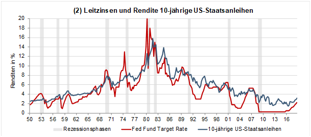 Den grössten Einfluss auf die Zinslandschaft hat aber die US-Notenbank. Der Fed-Chef Jerome Powell liess nach dem Zinsschritt im September durchblicken, dass das aktuelle Zinsniveau die Konjunktur immer noch stütze und es wahrscheinlich weit unter dem neutralen Niveau liege würde. Letzteres markiert jenen Punkt, an dem die Leitzinsen das Wirtschaftswachstum weder stützen noch bremsen und der vom Fed etwa bei 3 % angesiedelt wird. Weil fast alle US-Konjunkturdaten nach oben weisen und der Teuerungsdruck zunehmen wird, dürfte die US-Notenbank am eingeschlagenen Zinserhöhungsrhythmus festhalten. Wie stark die Leitzinsen erhöht werden, kann derzeit kaum abgeschätzt werden. Tatsache ist aber, dass es dem Fed fast nie gelungen ist, eine weiche Landung herbeizuführen, d.h. jeder Zinserhöhungszyklus der letzten 70 Jahre endete (früher oder später) in einer Rezession (siehe Grafik 2). In der traditionellen Sichtweise enden Bullenmärkte sechs bis zwölf Monate vor dem Beginn einer Rezession, wobei sich die Renditedifferenz zwischen den 10-jährigen Staatsanleihen und den Leitzinsen (Fed Fund Target Rate) typischerweise verringert oder in den negativen Bereich abrutscht. Perspektivisch kann diese Abfolge wieder eintreten, doch die Märkte halten sich nicht immer an das Drehbuch. Immerhin kann festgehalten werden, dass die vorlaufenden Indikatoren keine Hinweise auf eine Wachstumsverlangsamung und schon gar nicht auf eine Rezession liefern. Obschon die US-Anleiherenditen die Schmerzgrenze, die zu einer längeren Baisse an den Aktienmärkten führen könnte, vermutlich noch nicht überschritten haben, werden steigenden US-Zinsen die Börsen aber zumindest bremsen.