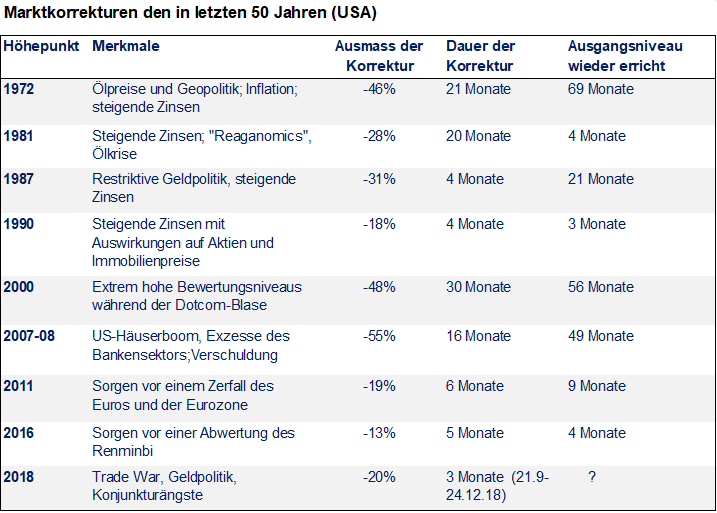 Zunächst gilt es sich zu verge­gen­wär­tigen, dass sich hinter den grössten Korrek­turen in den letzten 50 Jahren kein Muster erkennen lässt, weder in Bezug auf die Länge noch auf die Fallhöhe der Märkte. So erlitt die US-Börse im Herbst 1987 ohne offen­sicht­lichen Grund einen Tages­verlust von über 20 % und erreichte nach 21 Monaten wieder den Stand vor der Korrektur. Demge­genüber korri­gierten die Märkte nach dem Platzen der Techno­lo­gie­blase über eine Dauer von zweieinhalb Jahren und büssten knapp 50 % ein. Die Erholung nahm viereinhalb Jahre in Anspruch. Ein gemein­samer Aspekt, der fast jeder Korrektur zugrunde lag, war die «Einmi­schung» der Politik, allen voran der Geldpo­litik. So hat insbe­sondere die oft prozy­klische Stop-and-go-Politik der US-Notenbank entscheidend zu Hausse- und Baisse­phasen an den Börsen beigetragen.