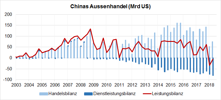 Unabhängig vom Handelskonflikt hat sich Chinas Aussenhandelsposition in den letzten Jahren stetig verschlechtert. Verantwortlich war das steigende Defizit der Dienstleistungsbilanz, das vor allem die zunehmenden Auslandsreisen und den damit einhergehenden Devisenabfluss widerspiegelt.