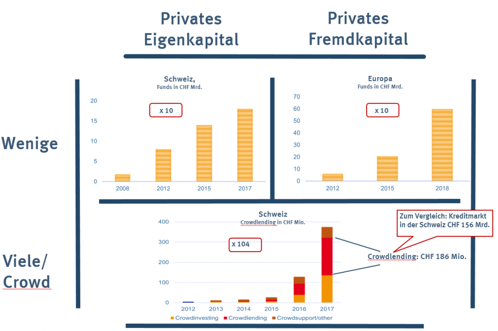 Während die Crowd Funding Seite sowohl auf der Eigenkapital‑, wie auch auf der Fremdkapitalseite noch sehr tiefe absolute Werte aufweist (mit 3‑stelligen Wachstumsraten), haben sich Funds zur Finanzierung von Private Debt, aber insbesondere von Private Equity sehr gut entwickelt und etabliert.