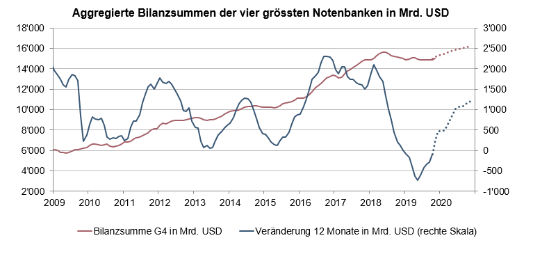 Die aggregierte Bilanzsumme der vier grössten Notenbanken ist seit 2008 von rund 6 Bio. USD bis Mitte 2018 auf knapp 16 Bio. USD gestiegen. Im Herbst 2017 kündigte die US-Notenbank an, dass sie ihre aufgeblähte Bilanz langsam abbauen und sich von einem Teil der Anleihebestände trennen werde. Die EZB stellte die Anleihekäufe per Ende 2018 ein. Diese Massnahmen haben dazu geführt, dass die aggregierte Bilanzsumme der Notenbanken im Jahr 2018 erstmals seit 2008 leicht gesunken ist.