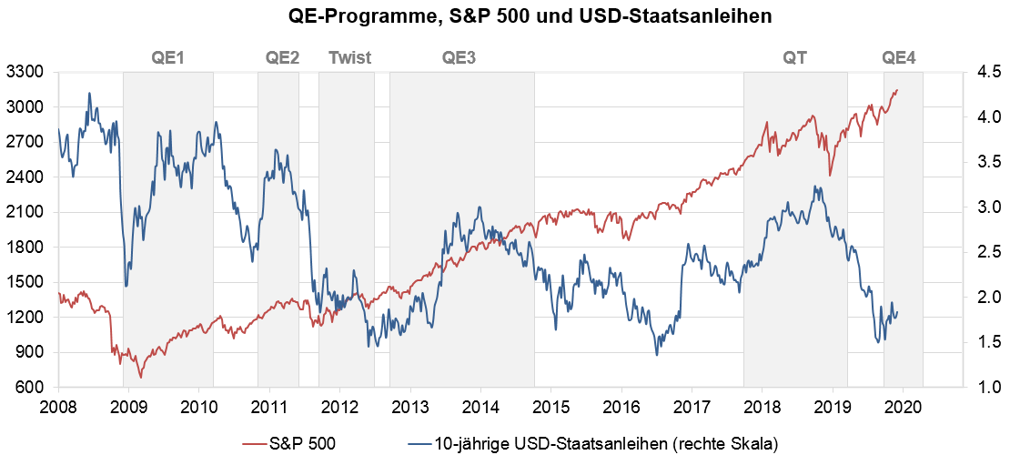 Die Reaktion des Fed liess nicht lange auf sich warten: Mit der Ankündigung von Zinssenkungen und drei Leitzinssenkungen im zweiten Halbjahr 2019 haben sich die Märkte stark erholt. Die plötzlichen Anspannungen am US-Repomarkt haben das Fed Mitte September zu massiven Liquiditätsspritzen bewogen. Um das Problem zu lösen, kauft das Fed wieder Staatspapiere im Umfang von USD 60 Mrd. pro Monat. Obwohl das Fed den Begriff “QE” vermeidet, entspricht der Effekt den früheren QE-Programmen. Die Anleihekäufe hängen mit den sinkenden Treasury-Beständen ausländischer Anleger zusammen. Auch die Tatsache, dass es sich für Europäer wegen der hohen Absicherungskosten kaum mehr lohnt, Treasuries zu kaufen, sorgt für eine sinkende Nachfrage. Weil es damit immer schwieriger wird, das wachsende US-Budgetdefizit zu finanzieren, ist das Fed in die Bresche gesprungen. Die EZB kauft seit Mitte November ebenfalls wieder Anleihen im Umfang von EUR 20 Mrd. pro Monat. In der Annahme, dass die Bank of Japan ihre Käufe fortführt, dürften die vier grössten Notenbanken in den nächsten 12 Monaten Liquidität im Umfang von mehr als einer Billion US-Dollar in die Märkte pumpen.