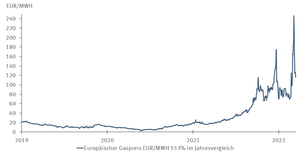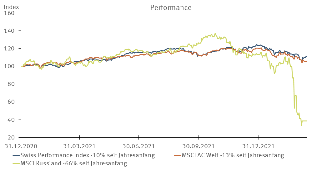 Russland ist der zweitgrösste Ölproduzent mit ca. 12 % des jährlich globalen Konsums. Auf Platz 1 sind die USA, Saudi Arabien belegt den dritten Platz. Ausserdem ist Russland der weltweit grösste Gasexporteur und deckt rund 16 % des jährlichen weltweiten Verbrauchs. Dazu kommt eine wichtige Stellung als Nickel-Produzent: Russland fördert rund 4 % der jährlich benötigen Menge. Elon Musk meinte kürzlich, dass die Beschaffung von Nickel zur Zeit das grösste Problem für die Produktion von «long-range» Autobatterien sei. Zusammen mit der Ukraine exportiert Russland zudem rund 25 % des Weizens für den globalen Bedarf. Diese Tatsachen führten bis dato in Jahresvergleich zu den folgenden Preissteigerungen: