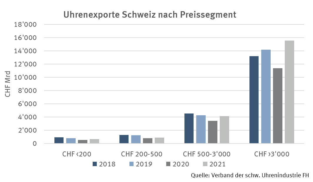 Auch mit den steigenden Kosten für Materialien oder Personal kann die Branche gut umgehen. Die Käufer von Luxus­schmuck und ‑uhren sind wenig preis­sen­sitiv. Die durch­ge­führten und geplanten Preis­er­hö­hungen haben kaum Einfluss auf das Verkaufs­vo­lumen. Oftmals übersteigt die Nachfrage das Angebot, besonders extrem ist dies bei den beiden Schweizer Uhren­ma­nu­fak­turen Patek Philippe und Rolex: Poten­zielle Käufer müssen für gefragte Modelle mehrere Jahre warten. In den letzten Monaten haben sich auch die Warte­zeiten bei anderen Uhren­marken verlängert. Wieviel davon auf Marketing bzw. künst­licher Verknappung und was auf einer zu geringen Produk­ti­ons­ka­pa­zität basiert, lässt sich nicht beurteilen. Fakt ist, dass die wertmäs­sigen Verkäufe hochprei­siger Uhren (mehr als CHF 3’000) in den letzten Jahren gestiegen sind, während die günsti­geren Preis­seg­mente weniger gefragt waren (vgl. Grafik Uhren­ex­porte). Die teuersten Zeitmesser haben das Vor-Corona-Niveau im Jahr 2021 bereits deutlich übertroffen, sowohl wertmässig als auch stückmässig.