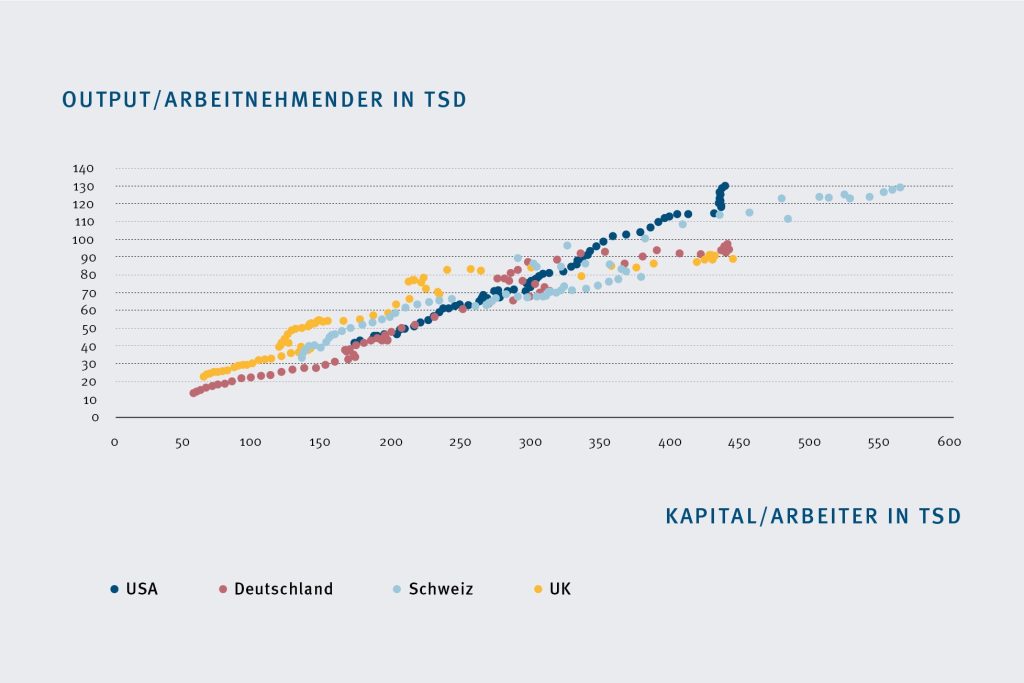 Über die letzten Jahrzehnte haben vor allem der rasante technologische Fortschritt und die Entwicklung in Richtung Informationszeitalter einen erheblichen Einfluss auf das Kapital und den Output pro Arbeitnehmer gehabt. Die weit verbreitete Nutzung von Computern, des Internets und digitaler Technologien hat die Produktivität und Effizienz in verschiedenen Branchen wie Fertigung, Dienstleistungen und Kommunikation gesteigert. Die Grafik zeigt die Stärke der USA, wenn es darum geht, technologische Entwicklungen in einen höheren Output pro Arbeitnehmer umzusetzen.