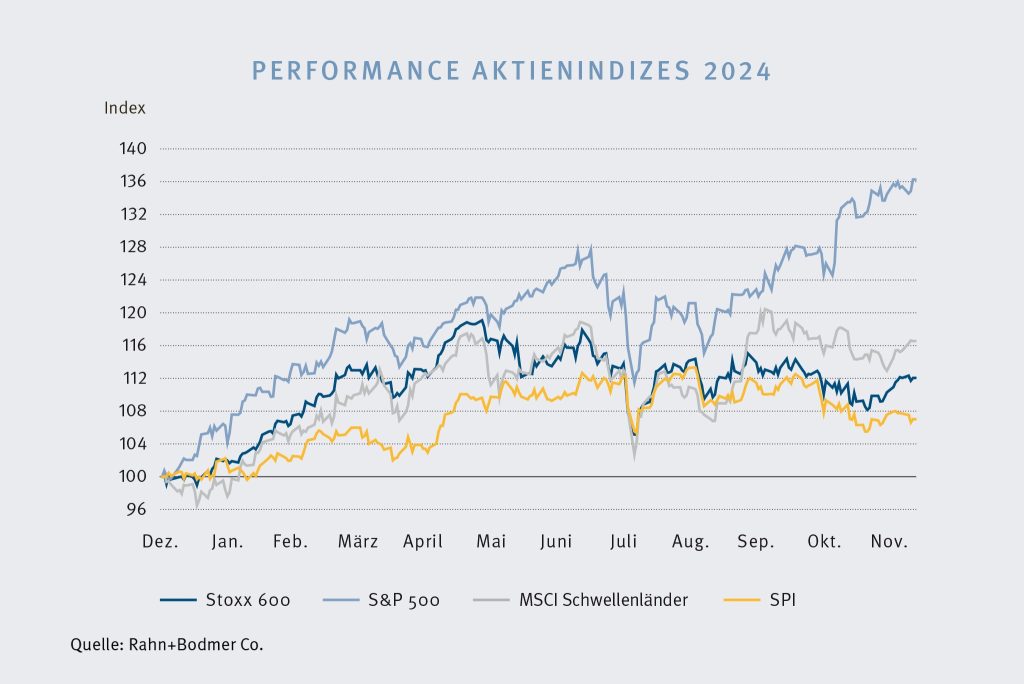 Das grosse Ereignis im zweiten Halbjahr war die US-Präsi­dent­schaftswahl. Mit dem späten Rückzug von Joe Biden war sie an Dramatik kaum zu überbieten. Tatsächlich schaffte Donald Trump das Husaren­stück und wurde im November zum 47. Präsi­denten gewählt. Die US-Aktien­märkte antwor­teten mit einem Kursfeu­erwerk, und der US-Dollar erstarkte, während der Rest der Welt auf Tauch­station ging. Die Androhung von schmerz­haften Zöllen wog zu schwer. Bis zum Jahresende konnten sich Europa und die Schwel­len­länder knapp halten, während der Schweizer Markt zurück­blieb. Trotz ausblei­bendem Jahres­end­spurt in Westeuropa endete das Aktienjahr 2024 mit einer erfreu­lichen Performance.