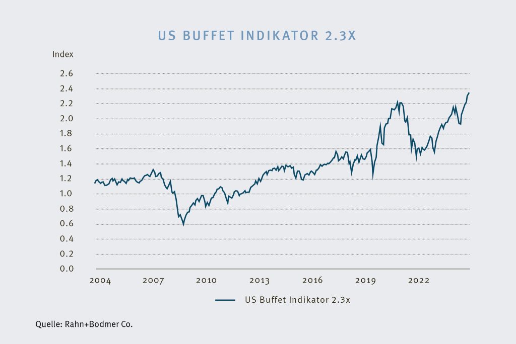 Der US-Markt hat also weiter an Dominanz gewonnen. Die Dimen­sionen zeigen sich auch in anderen Messgrössen: So misst beispiels­weise der Buffett-Indikator (Grafik unten) das Verhältnis der gesamten Markt­ka­pi­ta­li­sierung aller börsen­ko­tierten Unter­nehmen eines Landes zum Brutto­in­lands­produkt. Auch dieser hat vor allem dank den US-Hypers­calers neue Höchst­werte erklommen. Dabei hat sich jedoch die Diver­si­fi­kation innerhalb der ameri­ka­ni­schen Aktienwelt deutlich verschlechtert und die Abhän­gigkeit von der Kursent­wicklung der «Magni­ficent 7» wird zum zentralen Risiko­faktor. Allein die Kursrallye von Chipgigant Nvidia lässt aufhorchen. Seit Jahres­beginn konnte die Aktie zwischen­zeitlich rund 50 % zulegen; über die letzten fünf Jahre beträgt die Kursa­vance über 1’400 %. Über die letzten Wochen brachte das Unter­nehme eine Markt­ka­pi­ta­li­sierung von über USD 5 Billionen auf das Börsen­parkett – mehr als das Brutto­in­lands­produkt der gesamten deutschen Wirtschaft.