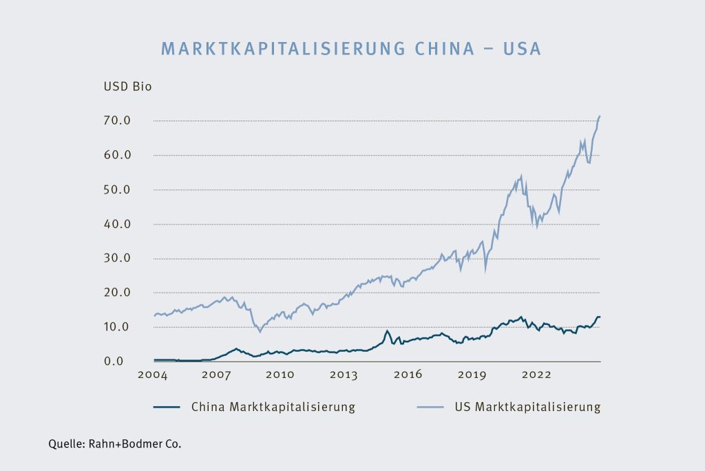 Mit dem Siegeszug der «Magni­ficent 7» haben sich die Gewichte des globalen Aktien­marktes nochmals signi­fikant verschoben. Vom globalen Aktien­index MSCI World fallen rund drei Viertel der Markt­ka­pi­ta­li­sierung auf ameri­ka­nische Werte. Ein Vielfaches anderer wichtigen Wirtschafts­mächten, wie zum Beispiel China, wo die Markt­ka­pi­ta­li­sierung deutlich kleiner ausfällt.